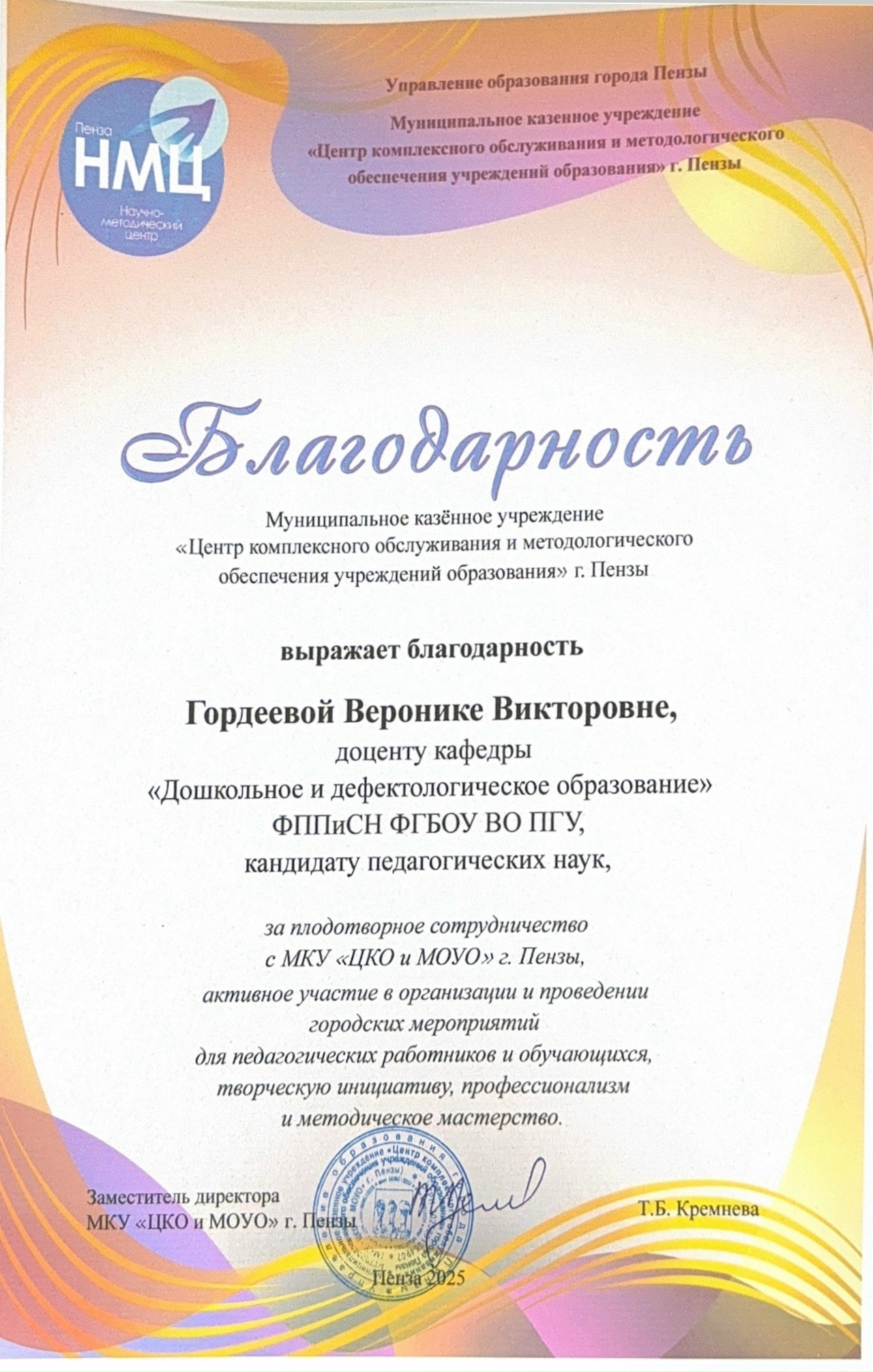 «Дошкольное и дефектологическое образование» В.В. Гордеева и М.В. Сычёва награждены благодарностью за плодотворное сотрудничество с МКУ "ЦКО И МОУО" г. Пензы в организации и проведении городских мероприятий для педагогических работников и обучающихся, творческую инициативу, профессионализм и методическое мастерство.