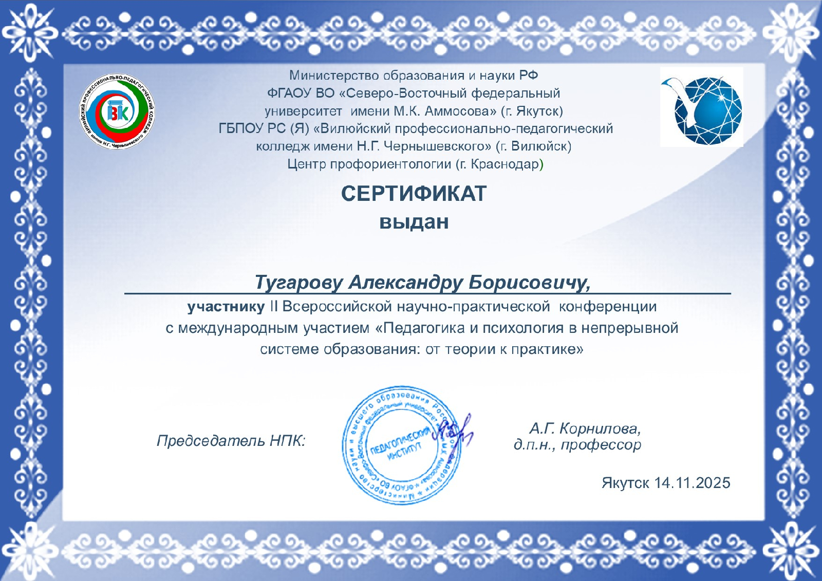 14 ноября 2025 года завершилась II Всероссийская научно – практическая онлайн-конференция «Педагогика и психология в непрерывной системе образования: от теории к практике». Организаторами стали Центр профориентологии (г. Краснодар), кафедра «Социальная педагогика» Северо-Восточного федерального университета имени М.К. Аммосова» (г. Якутск) и Вилюйский профессионально-педагогический колледж имени Н.Г. Чернышевского» (г. Вилюйск).